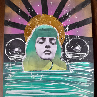 Infine, la danzante sirena, nell’opera “Mermaid” di Speciale, simbolo di estrema libertà, contrasta la tela materica in acrilico e cemento di Sergio Giannotta intitolata “Blu III”.